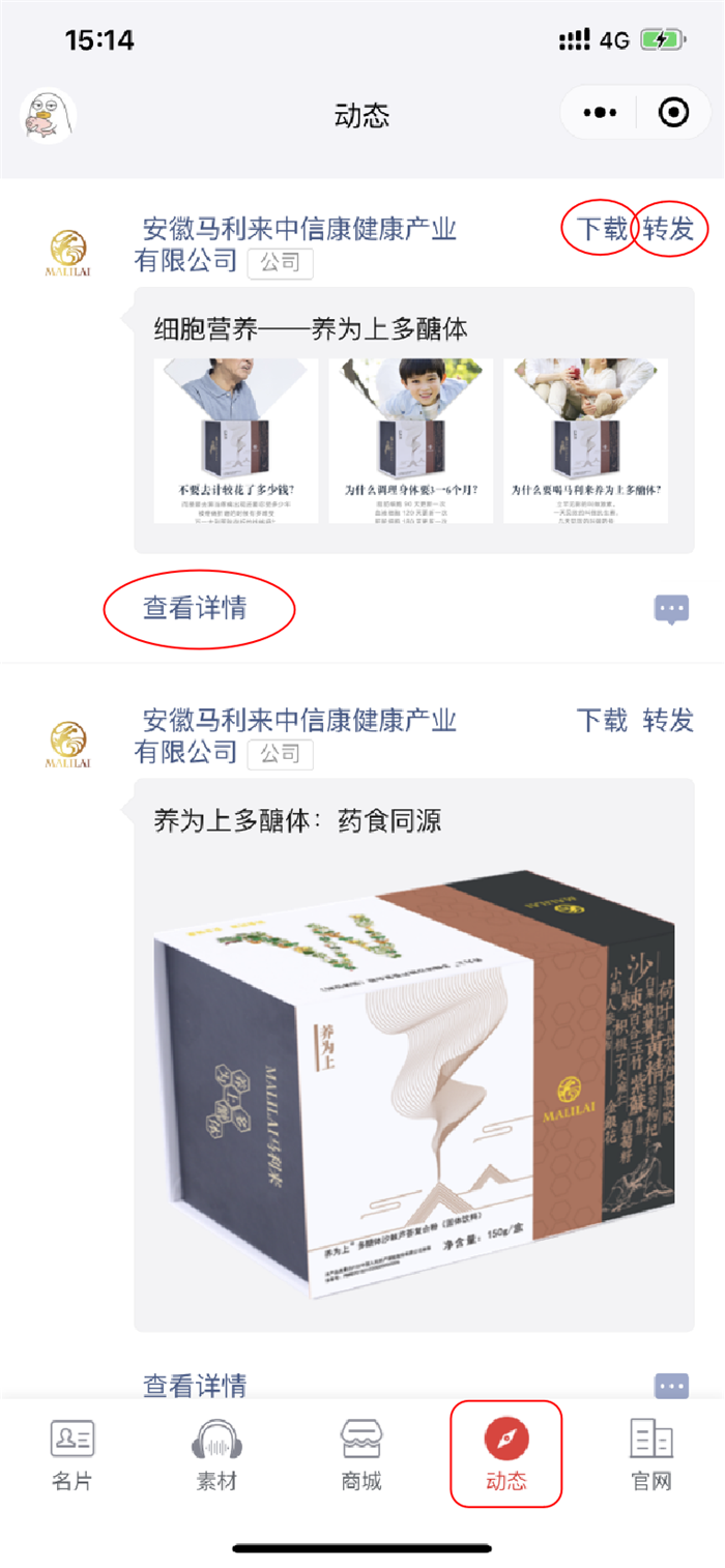 9.点击下方左数第四个按钮“动态”,可以及时了解马利来中信康最新动态,还可以下载和转发资讯哦!
